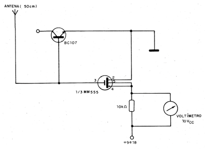 El movimiento de la aguja del indicador indica cuando algo o alguien se acerca al sensor, una antena que es un simple hilo estirado. El indicador puede ser la escala de tensiones de 10 o 15 V del multímetro. La alimentación del circuito se realiza con batería de 9 V. El colector del transistor, que puede ser un BC548 debe permanecer apagado.