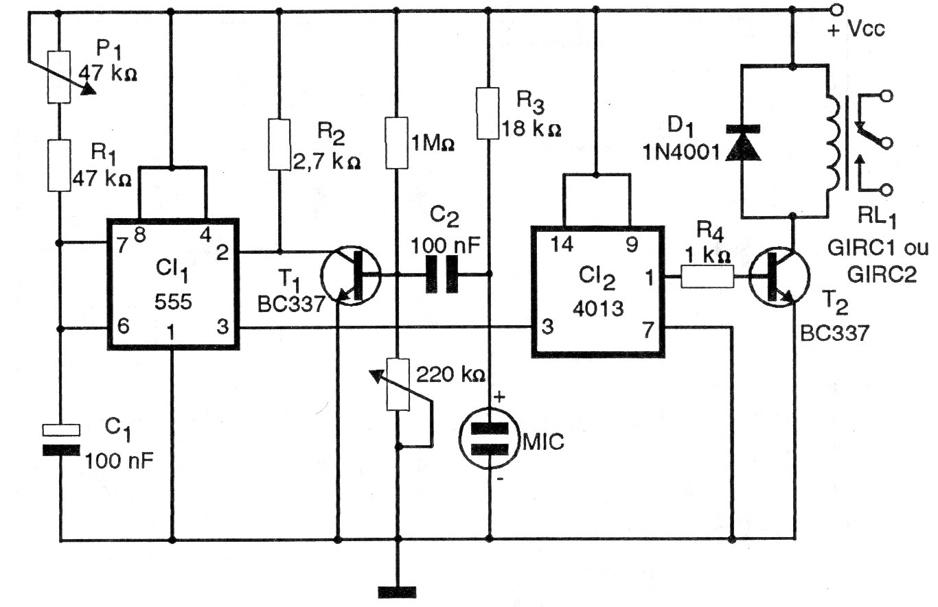 La finalidad de este circuito es detectar el sonido de las palmas, accionando un relé de modo biestable. El circuito utiliza un micrófono de electreto y se ha encontrado en una publicación de 1997. El relé puede ser de 6 o 12 V según la alimentación utilizada. El circuito tiene su disparo y sensibilidad controlados por P1 y P2.