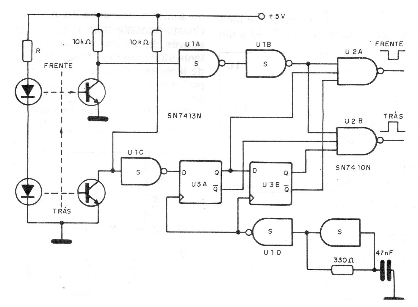 Esta llave óptica bidireccional detecta el sentido del movimiento de un objeto que pasa entre ellas. El circuito es de un manual de optoelectrónica de Texas Instruments de 1992 y la alimentación es de 5 V, pues se trata de aplicación con lógica TTL. La velocidad máxima de paso depende de la familia lógica elegida.