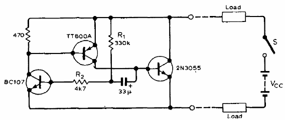 Este circuito monitorea la corriente en las cargas. Los transistores NPN y PNP admite como equivalentes el par BC547 y BD136. El 2N3055 debe estar dotado de un disipador de calor conforme a la carga y la corriente máxima es del orden de 5 A.