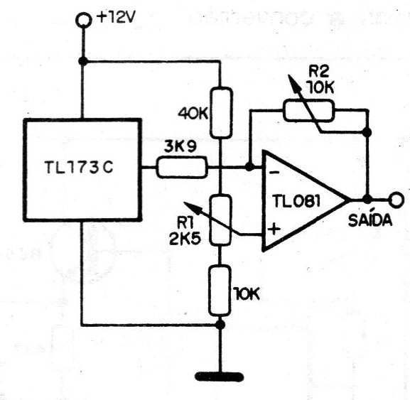Este circuito se utiliza como sensor de campos magnéticos y se basa en un sensor de efecto HaII de Texas Instruments. El uso de un amplificador operacional permite linealizar la respuesta al campo externo y ajustar en exactamente 6 V la tensión de salida en un determinado nivel de referenciado campo magnético.