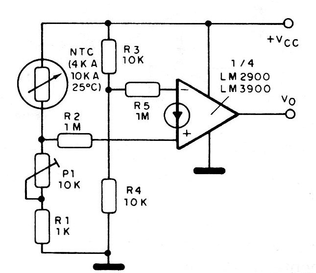 En el caso de que se produzca un cambio en el valor de la temperatura, se puede utilizar el amplificador de Norton como control de sobre temperatura, es decir, conmutando una carga externa cuando la temperatura sobrepasa el límite establecido por el ajuste en el potenciómetro. El termistor utilizado como sensor (NTC) debe tener la resistencia del mismo orden que el ajuste deseado para el potenciómetro, de modo que, en el umbral del disparo, tengamos en la entrada de referencia (entrada +) una tensión de aproximadamente la mitad de la tensión de alimentación. Observe que el uso de resistores de altos valores en las entradas hace que el dispositivo opere en términos de diferencia de tensión de entrada y no de corriente.