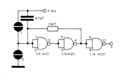 La configuración biestable de la figura se puede utilizar para encender y apagar un dispositivo, o bien producir un pulso de mando en las mismas condiciones. Se utilizan tres de las 4 puertas NAND de dos entradas y eventualmente la cuarta si se desea una inversión de acción. El capacitor y el resistor son importantes, pues mientras el primero determina la inmunidad a ruidos y la velocidad de acción, el segundo determina las características de disparo. Recuerde que para el disparo de cargas de corrientes un poco elevadas es necesario utilizar un paso amplificador. Una aplicación es como shield para microcontroladores.