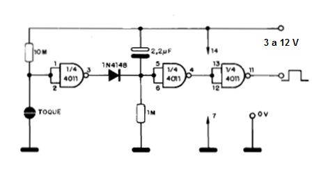 Un toque en el sensor, formado por dos chapas de metal separadas y que deben ser tocadas al mismo tiempo, produce un pulso de salida cuya duración depende del capacitor de 2,2 uF. El circuito funciona con tensiones de 3 a 12 V y nunca debe ser alimentado por fuente sin transformador. Con él tenemos la garantía de que en la entrada del microcontrolador se aplica un solo pulso independientemente del toque del sensor.