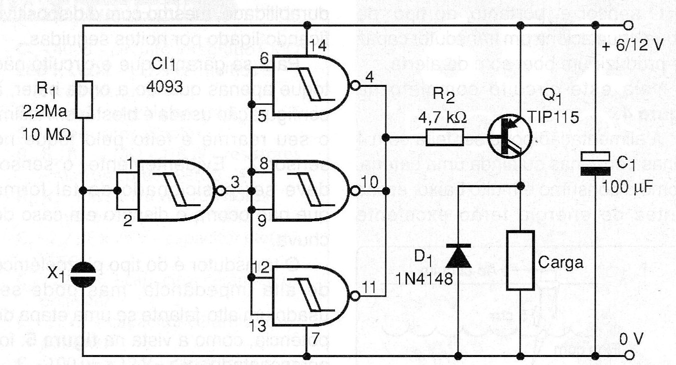 En la figura mostramos nuestro primer circuito que consiste en una llave de toque simple capaz de accionar un relé u otras cargas con corrientes hasta 1 A, para el caso del transistor usado. Los transistores equivalentes de mayor corriente se pueden utilizar para obtener el control de cargas mayores. Cuando el sensor es tocado, la salida de la primera puerta va al nivel alto y con ello las puertas siguientes, conectadas en paralelo, recibiendo esa señal, tienen su salida yendo al nivel bajo. El nivel bajo se aplica a la base del transistor que luego satura el suministro de la carga. Observe que el circuito permanece activado sólo durante el tiempo en que se toca el sensor. Al retirar los dedos del sensor, la carga se desactiva inmediatamente. El circuito puede funcionar con tensiones de 5 a 12 V, dependiendo sólo de la carga a ser alimentada. El resistor R1 determina la sensibilidad al tacto. Para el sensor utilice dos planchas de metal alejadas de 1 mm de modo que se puedan tocar simultáneamente y no utilice cables más largos que 1 m para su conexión al circuito. El transistor debe montarse en un radiador de calor si la corriente de carga es superior a 200 mA.
