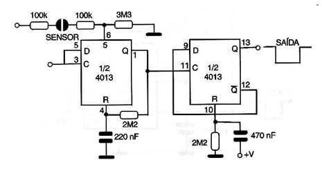 Uno de los circuitos de aplicaciones que dimos con el 4013 en este banco de circuitos fue una clave biestable en la que el 555 se utilizaba como monoestable en el accionamiento de un 4013. Pues bien, si vamos a utilizar sólo un flip-flop en el accionamiento de un relé, puede perfectamente ser utilizado como monoestable, como muestra la configuración de la figura que funciona como una excelente llave de toque. En esta llave, cada toque en el sensor, el relé cambia de estado, conmutando así una carga externa.