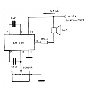 Este circuito es sugerido por National Semiconductor y se basa en el circuito integrado dedicado LM1830. El sensor es de contacto con el líquido, en el caso una punta de hilo descascarado. Con una alimentación de 16 V el consumo del circuito es de sólo 5,5 mA. La alimentación se puede hacer con tensiones de 9 a 16 V y excita directamente un altavoz de 64 ohms de impedancia.