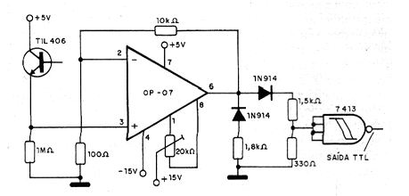 Este circuito permite acoplar señales ópticas a una entrada TTL con excelente rendimiento. Entre las posibles aplicaciones sugerimos la utilización en enlaces con fibras ópticas. La foto transistor es Texas, que sugiere la aplicación, pero equivalentes se pueden experimentar. El funcionamiento se alimenta con dos tensiones (5 V simples y 15 V simétricos).