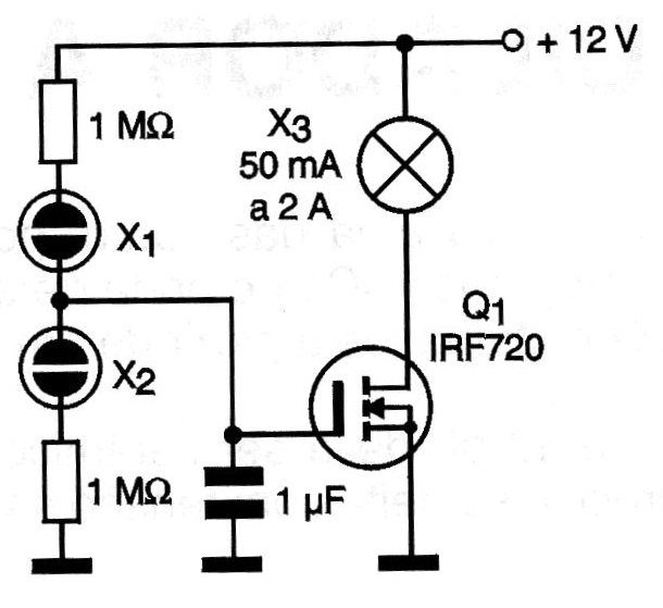 Un toque en el sensor X1 y el capacitor C1 se carga haciendo que el transistor de potencia conduzca encendiendo la lámpara. Un buen capacitor (con pocas fugas) debe retener la carga por un buen tiempo manteniendo la lámpara encendida. Para borrarla, basta con descargar el capacitor tocando en X2. El circuito se puede utilizar como dimmer de tacto o en otras aplicaciones. El FET de potencia debe ser elegido de acuerdo con la corriente de la carga que va a ser controlada.