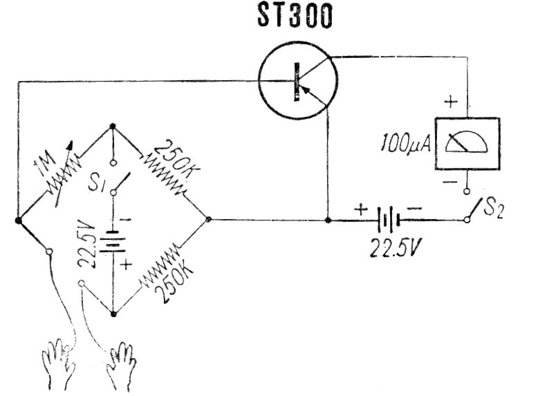 En realidad, este circuito encontrado en una publicación japonesa de los años 60, funcionará con cualquier transistor PNP de uso general. Y en lugar del indicador se puede utilizar un multímetro analógico común en una escala baja de corriente con un resistor de 1 k en serie. Con transistores más modernos la alimentación puede quedar entre 3 y 9 V.