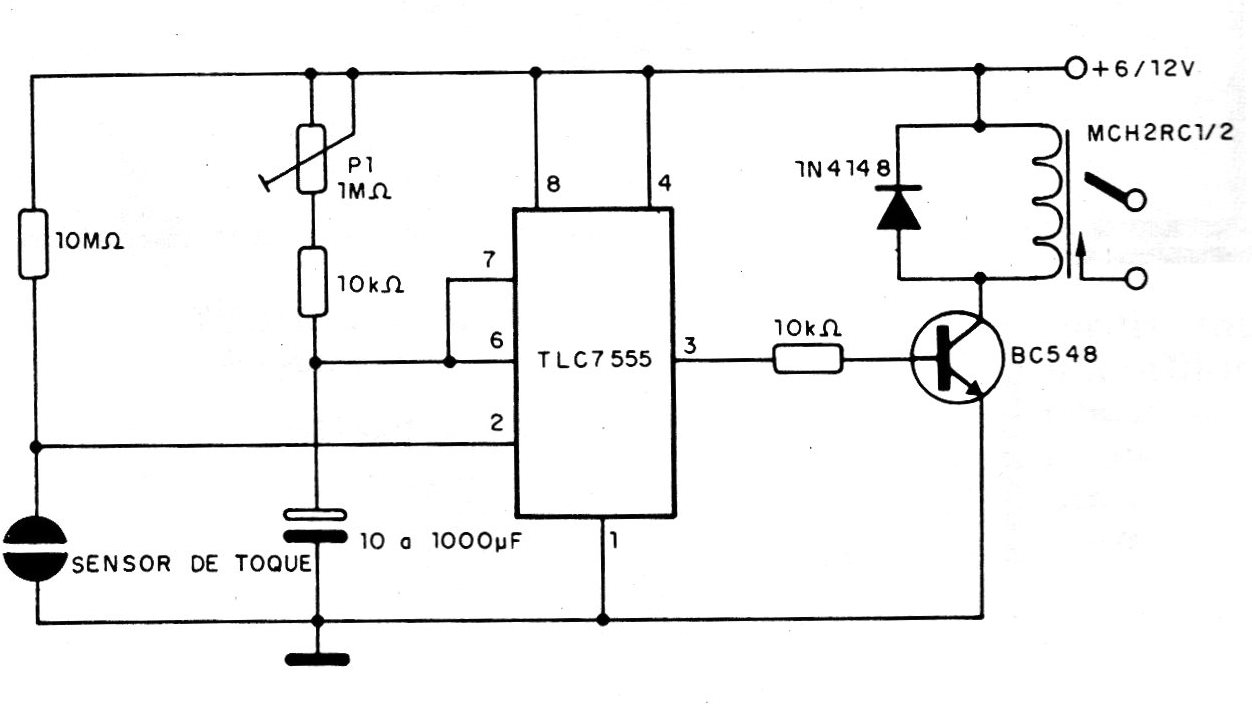 En la figura tenemos una configuración interesante en la que aprovechamos la elevadísima impedancia de entrada del perno de disparo del TLC7555 en la configuración monoestable, para elaborar un interruptor de toque temporizado o un temporizador temporizado. Los resistores de valores tan altos como 50 M ohms se pueden utilizar en la polarización de entrada de disparo de este integrado, lo que garantiza una enorme sensibilidad al circuito. La temporización en esta aplicación se ajusta en el potenciómetro P1.