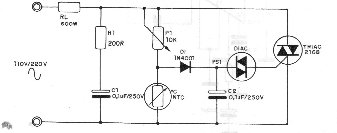 Encontramos este circuito en una publicación de 1987. Se trata de un dimmer convencional con triac para control de temperatura de planchas de soldar y otros elementos de calentamiento hasta 600 W. El triac debe estar dotado de disipador de calor. El ajuste del rango de temperaturas se realiza en P1 y depende del NTC.