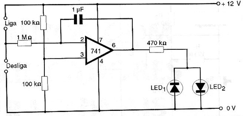 Este circuito se basa en la configuración biestable pero con la diferencia que los valores de los componentes se cambian para permitir el disparo a partir del toque de los dedos en dos sensores. Se utilizan dos LEDs en oposición si el circuito se presenta con fines didácticos. Tocando en uno de los sensores uno de los LED se enciende y el otro se apaga. Con el toque en el otro sensor, el LED que estaba encendido apaga y el que estaba apagado se enciende. En la figura 1 tenemos el diagrama completo de esta llave de toque. Observe que el uso de una red divisora con dos resistores para la tensión de referencia elimina la necesidad de una fuente simétrica. También podemos utilizar en este circuito una etapa de accionamiento para cargas de mayor potencia como, por ejemplo, un relé.