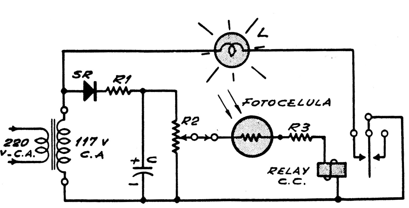 Este circuito activa un relé, encendiendo una lámpara cuando el sensor recibe luz. El sensor es un LDR grande de alta tensión que puede operar directamente con 110 V, accionando un relé de 3 mA x 10k para alta tensión. El rectificador puede ser el 1N4004 y el transformador tiene de 10 a 20 mA de corriente de secundario, o más. R1 es de 5,6 ohmios x 1 W y R3 de 10k x 5 W. El potenciómetro es de hilo de 22k.