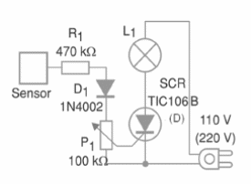 Sólo tiene que tocar el sensor para que la lámpara L1 se encienda. El circuito no tiene bloqueo, lo que quiere decir que la lámpara se apaga al dejar de tocar el sensor. La lámpara debe ser incandescente de 10 a 60 W. El ajuste de la sensibilidad se debe realizar en P1. Asegúrese de que el circuito no está aislado de la red de energía. Este circuito salió en el libro Science Fair Projects de Newton C. Braga, publicado en Estados Unidos.