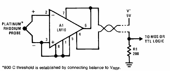 El circuito presentado fue encontrado en el Linear Applications Handbook de National Semiconductor de 1994. El sensor es un par termoeléctrico y la salida es compatible con la lógica TTL. El circuito puede funcionar, por lo tanto, como shield de entrada para microcontroladores.