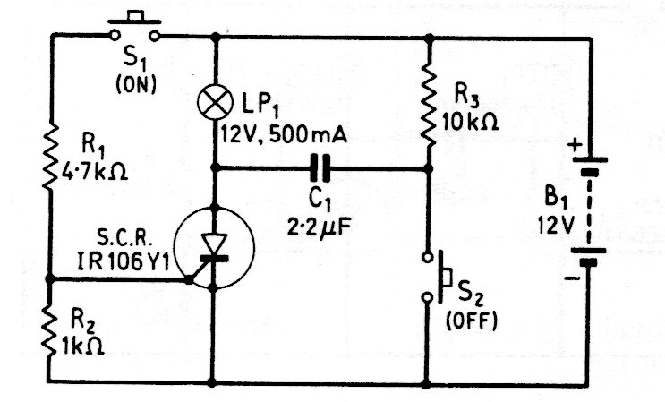 En la figura tenemos el modo de rearmar (apagado) un SCR usando un interruptor de presión en un circuito capacitivo. Sólo hay un toque momentáneo en el interruptor 2 para apagar el SCR disparado por S1. El circuito puede ser adaptado para operar como escudo, siendo enviado un pulso negativo de rearme a través de C1.