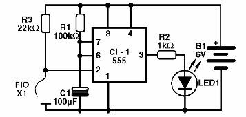 Con un toque en el cable sensor X1, que también puede ser un interruptor de presión, el LED se enciende por un tiempo que depende de C1 y R1. La constante de tiempo es 0,7 x R1 x C1, pudiendo ir hasta más de media hora con un condensador de 1 000 uF y una resistencia de 1M5. La alimentación se puede hacer con tensiones de 5 a 12 V. El LED puede ser de cualquier tipo o color. El 555 CMOS también puede ser empleado, obteniéndose un circuito de bajo consumo cuando en espera.
