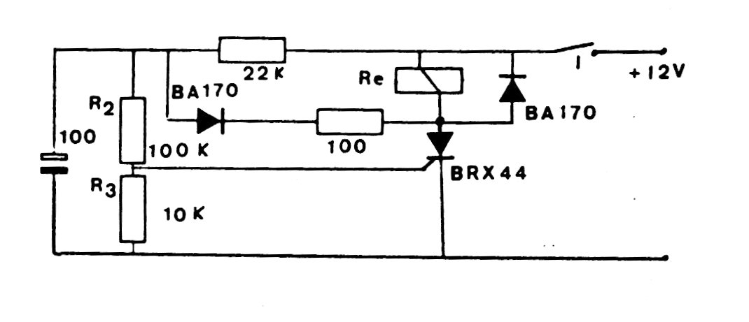 Este circuito de la década de los 90 hace uso de un transistor programable unijunción (PUT) y la temporización puede llegar a varios minutos dependiendo del condensador usado. El circuito acciona directamente un relé de acuerdo con la tensión usada en la alimentación.
