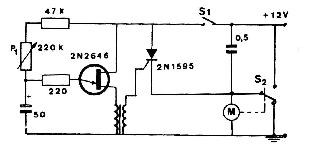 Esta es una configuración antigua de temporizador para el limpiador de parabrisas, usando un transistor unijuntura. El circuito acciona un SCR por un tiempo que se puede ajustar en el potenciómetro.