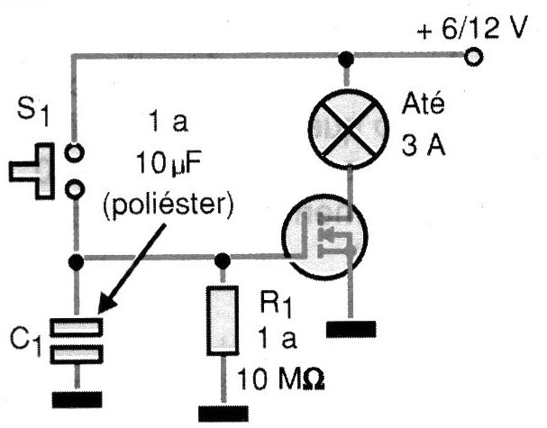 En la figura tenemos un temporizador que puede accionar una lámpara hasta 3 A o aún un LED de alto brillo con un resistor en serie de valor apropiado. La tensión de alimentación depende de la lámpara o de los LED. Presionando S1, el condensador se carga llevando el transistor a la conducción por un tiempo que depende del valor de C1, y también de R1. Por supuesto, otros tipos de carga pueden ser usados, como motores, solenoides, electroimanes, elementos de calefacción o refrigeración (efecto Peltier), etc..Para los valores indicados, tenemos una temporización de hasta algunos minutos.