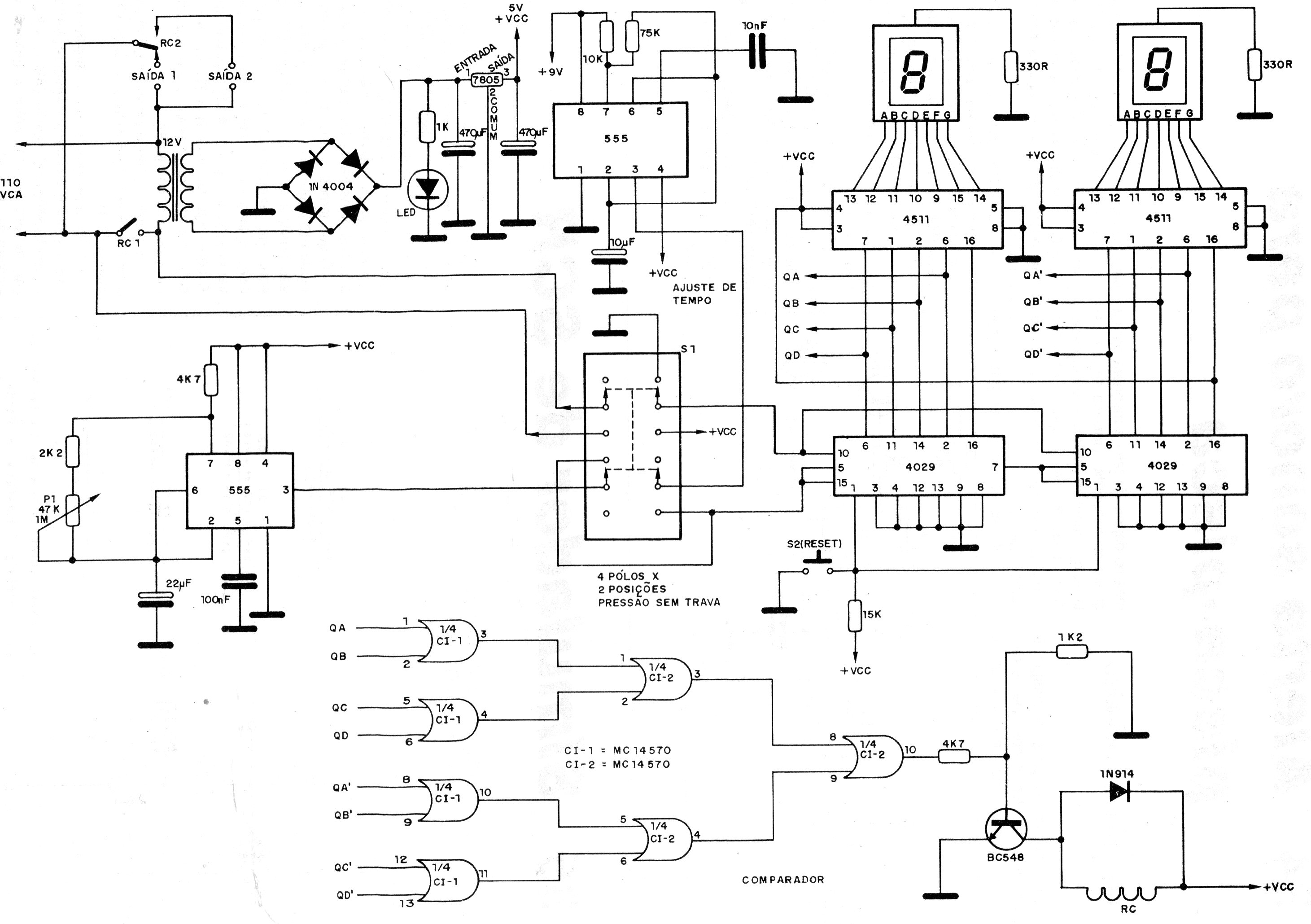 Este temporizador hace la cuenta atrás de los tiempos hasta que, al final activa un relé. El tiempo de programación se obtiene presionando S1 y S2 simultáneamente. Soltando S2 y manteniendo S1 presionada se obtiene el tiempo. El circuito tiene dos bases de tiempo, siendo una de 1 Hz y otra ajustable. El circuito ya incluye fuente y los displays son de cátodo común.