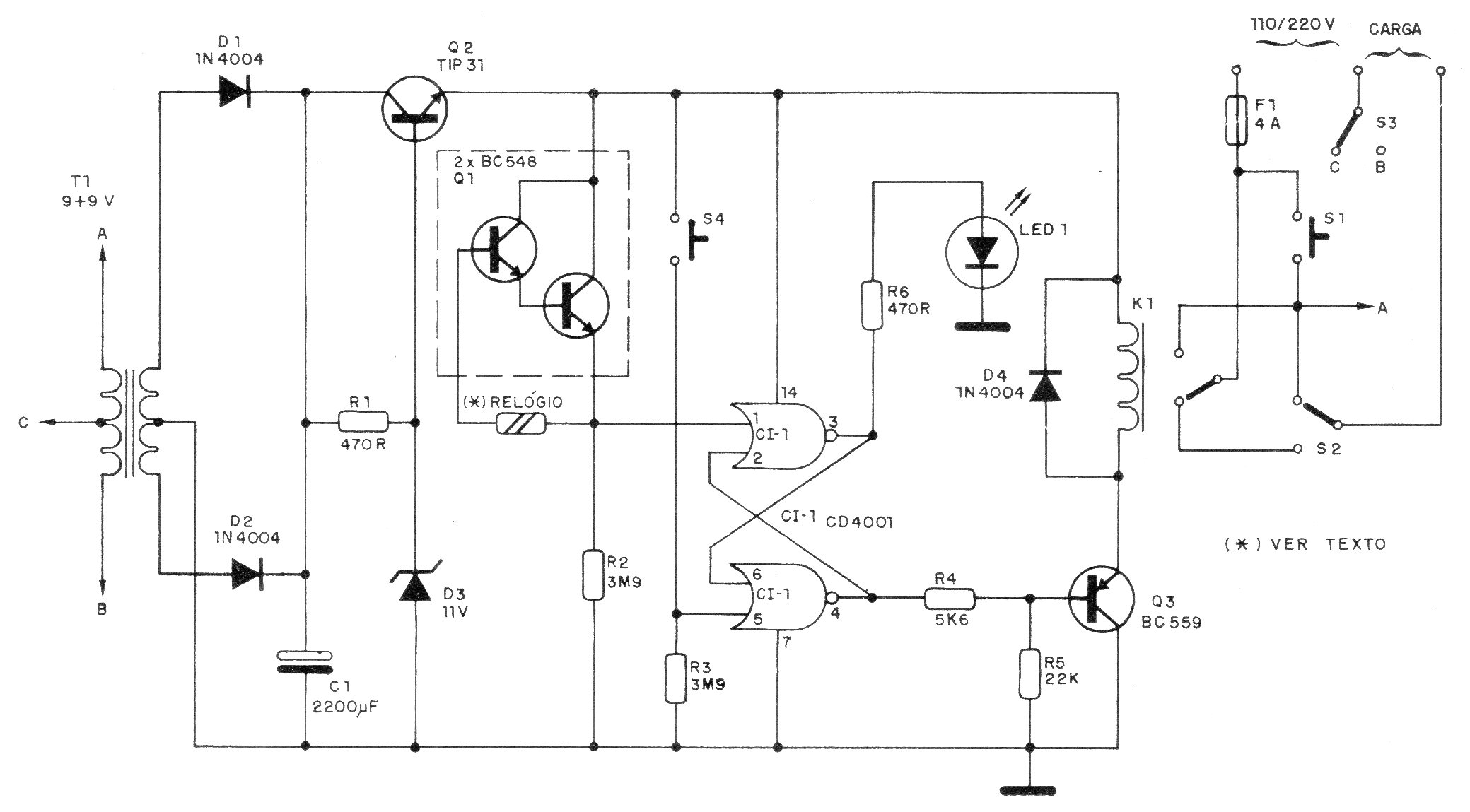 Este circuito fue encontrado en una documentación de 1987. Se trata de un temporizador que aprovecha la señal de un reloj digital común. Cuando activamos el circuito, accionando S1 entra en espera activando un relé cuando una señal del reloj digital es detectada (pulso). El circuito utiliza componentes comunes que se pueden encontrar con facilidad y tiene una acción biestable.