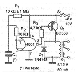 En la figura mostramos un temporizador, este simple con sólo una de las cuatro puertas del circuito integrado 4001. Este circuito entra en acción cuando la alimentación conectada, en cuyo caso activa el relé. Podemos usarlo como un circuito de accionamiento retardado para equipos sensibles a aplicaciones bruscas de la tensión de alimentación. Al final del tiempo determinado por R1 y C1, el relé es activado, energizando la carga externa. Podemos invertir su acción usando un transistor NPN. El mayor valor para R1 es 1 M ohms y para C1 es 2 200 uF caso en que tiempos hasta más de media hora pueden ser obtenidos. Los tiempos mayores se ve comprometidos principalmente por la inestabilidad causada por las fugas en el capacitor. Utilizando un Darlington de potencia como el TIP115, cargas con corrientes hasta 1 A pueden ser controladas directamente.