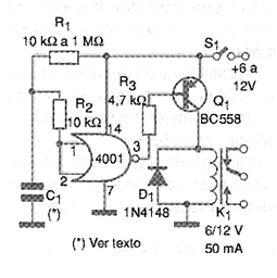 En la figura mostramos otro temporizador, este más simple pues usa sólo una de las cuatro puertas del circuito integrado 4001. Este circuito entra en acción cuando la alimentación conectada, en cuyo caso activa el relé. Podemos usarlo como un circuito de accionamiento retardado para equipos sensibles a aplicaciones bruscas de la tensión de alimentación. Al final del tiempo determinado por R1 y C1, el relé es activado, energizando la carga externa. Podemos invertir su acción usando un transistor NPN. El mayor valor para R1 es 1 M ohms y para C1 es 2 200 uF caso en que tiempos hasta más de media hora pueden ser obtenidos. Los tiempos mayores se ve comprometidos principalmente por las inestabilidades causadas por las fugas en el condensador. Utilizando un Darlington de potencia como el TIP115, cargas con corrientes hasta 1 A pueden ser controladas directamente.