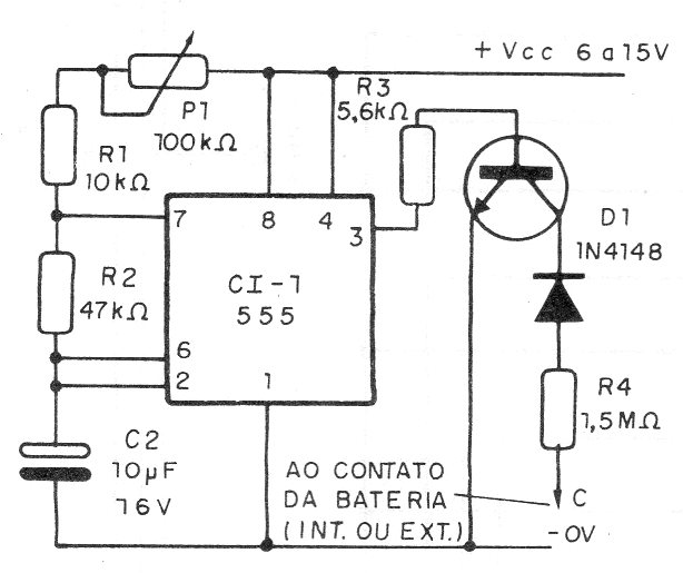 Conectado al contacto de una batería (por ejemplo, el plato del címbalo), este circuito de una documentación de 1993 produce la marcación automática del compás. El circuito debe ser alimentado por la propia fuente de la batería o pilas con una tierra en común. P1 ajusta el ritmo.