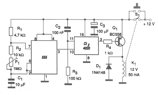 Uno de los problemas del circuito integrado 555, normalmente usado cuando se desea una temporización, es que más allá de 1 hora, la necesidad de capacitores y resistores de valores elevados hace el circuito inestable. De hecho, el tiempo máximo de este orden se debe a la limitación del condensador a 2 200 uF aproximadamente y de la resistencia alrededor de 1,5 M ohmios. Una forma de obtener largas temporizaciones, superando las 15 horas como en el caso del circuito que presentamos en la figura es con la utilización de un contador binario de 14 etapas CMOS, como el circuito integrado 4020. Así, los pulsos generados por el 555 se cuentan hasta 16 384 antes de que el relé se accione, terminando así la temporización. Es fácil percibir si el 555 genera 1 pulso cada 10 segundos, llegar a una temporización de 160 840 segundos! En el circuito mostrado, la temporización comienza cuando se pulsa el botón S1, en cuyo caso el relé cierra los contactos y el 555 comienza a oscilar. Al final de la cuenta, el relé abre los contactos apagando el circuito automáticamente. El ajuste de la temporización se realiza en P1. Para obtener una precisión de ajuste se puede conectar en el pino 3 del 555 un LED en serie con una resistor de 1 k ohms, ajustándose entonces la frecuencia de las pulsaciones. El intervalo de los intermitentes, multiplicado por 16 384, dará la temporización ajustada. El circuito puede funcionar con relés de 6 V y el valor de C1 se puede cambiar a diferentes bandas de tiempo. Observamos que durante el intervalo de la temporización el relé permanece energizado, siendo básicamente la corriente en su bobina que determinará el consumo del aparato. El resistor y el capacitor en el perno 11 de reset garantizan que el recuento del 4020 parta de cero.