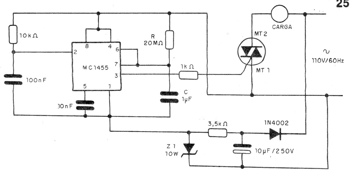 Encontramos este circuito en un artículo de nuestra autoría de 1992. El circuito tiene como base un circuito integrado equivalente al 555. Controla un Triac que mantiene una carga accionada por 22 segundos después de ser conectado. El triac debe ser de acuerdo con la carga y dotado de disipador de calor.