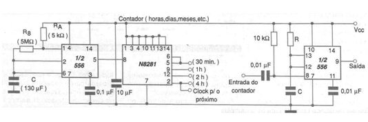 En la figura tenemos un circuito en el que dos 555 operando uno como astable y otro como monoestable permiten obtener temporizaciones muy largas, llegando a 4 horas en la versión dada y más, si se agregan bloques adicionales de conteo. En este circuito, el primer 555 produce pulsos con intervalos de 30 minutos, los cuales se aplican a un contador / divisor de frecuencia N8281 o equivalente. Los pulsos con las temporizaciones deseadas, obtenidos en la salida de ese contador / divisor se aplican a un 555 monoestable, proporcionando así el mando de salida. En el diagrama, en lugar de ser utilizados dos 555, encontramos un doble 555 (556) con las pinares correspondientes. La etapa de salida producirá un pulso cuya duración dependerá de R y de C. Este pulso puede ser usado para accionar una etapa de potencia con un relé u otro dispositivo como carga.