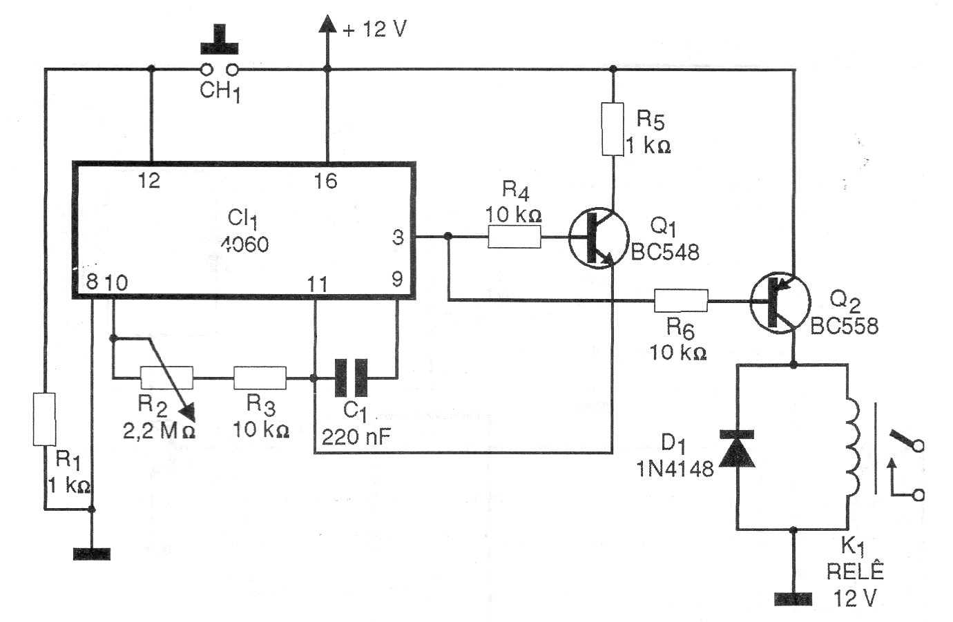 Este circuito fue encontrado en una revista de 1997. Utiliza un circuito CMOS 4060 alimentado por 12 V que es la tensión del relé excitado. El ajuste del tiempo va de 30 segundos a una hora y media con los componentes indicados, pero el condensador C1 puede ser aumentado para tiempos más largos.