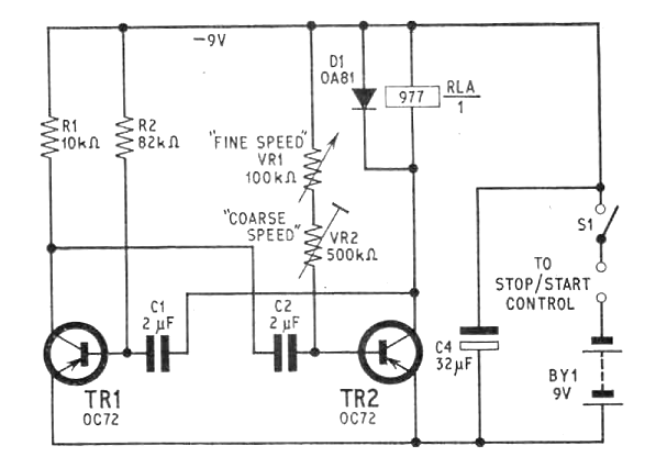 Este circuito es de una publicación inglesa de 1965. Los transistores usados son raros, pudiendo, sin embargo, ser cambiados por tipos más modernos como los BC558. El circuito puede ser alimentado por 6 V o 9 V según el relé usado y los capacitores pueden ser alterados para obtener otras temporizaciones. El relé actúa de forma intermitente, según los ajustes.