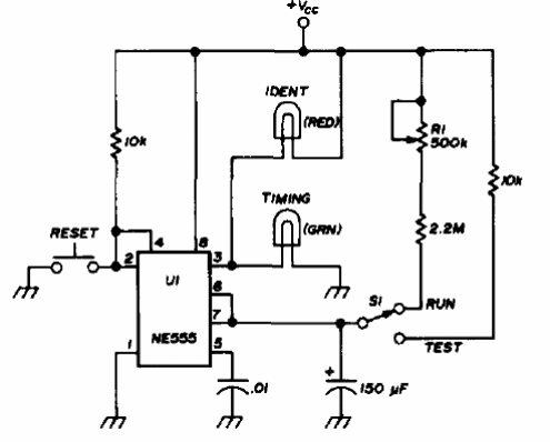 Este temporizador, de una antigua publicación americana, utiliza lámparas indicadoras, pero puede ser modificado para usar LEDs en serie con resistencias de 1 k. El circuito proporciona intervalos de 7 a 11 minutos, ajustados en R1. La alimentación, para el caso de LED, puede ser hecha con tensiones de 5 a 12 V.