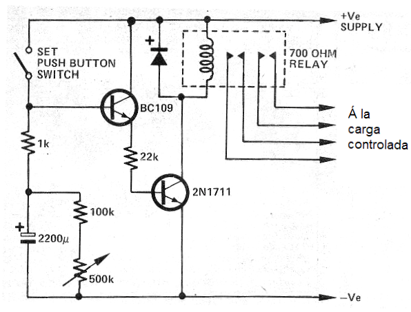 Presionando p push-button por unos segundos, el capacitor de 2 200 uF se carga y con ello el relé arma, alimentando la carga. Cuando soltamos el push button, el capacitor se descarga lentamente por el circuito y por el potenciómetro de ajuste de tiempo, manteniendo así el relé cerrado por un intervalo de tiempo determinado. El potenciómetro y el capacitor se pueden aumentar para obtener largos intervalos de tiempo. El circuito fue publicado en una revista inglesa de mayo de 1977. El BC109 puede ser sustituido por el BC548 y el 2N1711 por un BC548 también para relés hasta 100 mA y para relés hasta 500 mA por un BD135. La tensión de alimentación es de 12 V.