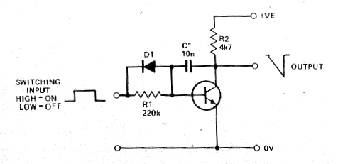 Los osciloscopios y muchos instrumentos emplean bases de tiempo que requieren una rampa lineal para su funcionamiento. Esta rampa puede ser generada por un circuito de Miller o diente de sierra lineal. En la figura siguiente tenemos uno de estos circuitos, sugerido por el Electronics Digest de 1984. Este circuito utiliza un transistor de uso general conmutador como el 2N2222 o incluso BC548 y funciona con tensiones de 9 a 12 V. La señal de entrada es rectangular y su frecuencia determina Básicamente el valor de C1 junto con R1 para la rampa decreciente deseada.