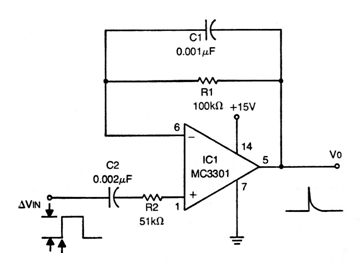 Encontramos este circuito en una publicación de Motorola de los años 70. El circuito puede ser implementado con amplificadores operacionales modernos. Los valores de la red R1 / C1 determinan la constante de integración pudiendo ser alterados. Otras tensiones de alimentación se pueden utilizar según las características del operacional.