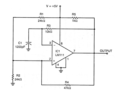 Este circuito puede ser implementado con amplificadores operacionales más modernos como el 741 y su frecuencia máxima está alrededor de 100 kHz, determinada por C1. El circuito no requiere fuente simétrica, pudiendo trabajar con tensiones mayores. La salida es rectangular y los resistores de 24 k pueden ser de 27k que es el valor actual estandarizado más cercano.