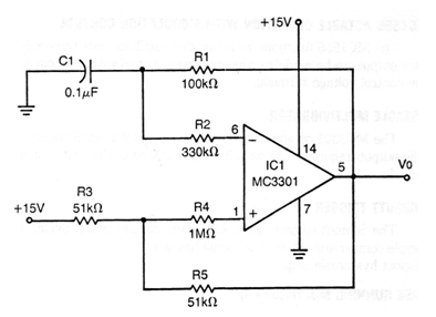 Este oscilador emplea un amplificador operacional de Motorola común en los años 70. Podemos implementar la misma configuración con un amplificador operacional común en nuestros tiempos como el 741. La frecuencia es dada por C1 y para este circuito estará alrededor de 1 kHz. La frecuencia máxima depende sólo del amplificador operacional utilizado. El circuito no necesita una fuente simétrica y la señal de salida es rectangular. R3 y R5 pueden ser de 47k.