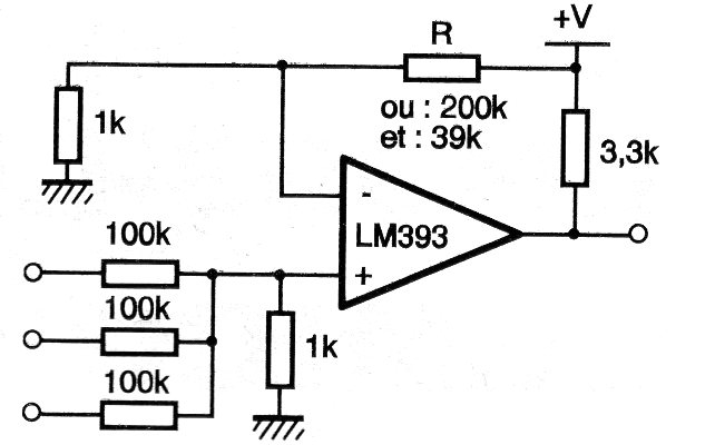En la figura tenemos el modo de implementar un puerta lógica o (OR) con un LM393. El circuito debe ser alimentado por una fuente simétrica y otros operacionales pueden ser empleados.