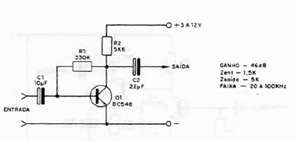 Con una ganancia de 46 dB este paso puede ser usado para amplificar la señal de micrófonos y otros transductores o de receptores experimentales y otros circuitos que suministran señales insuficientes para excitar la entrada de amplificadores. El consumo es muy bajo y el circuito puede ser alimentado por fuente, pilas o batería. El circuito sólo funciona con señales en la faja de audio.