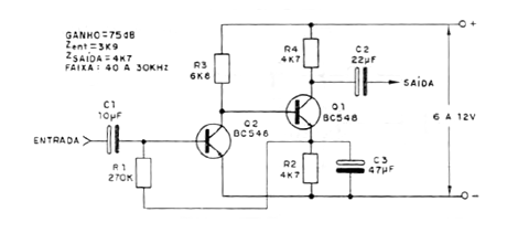 El circuito abajo tiene una ganancia de 75 dB siendo ideal para trabajar con señales de micrófonos y otras fuentes de señales débiles que no logran excitar convenientemente la entrada de amplificadores. El circuito tiene un consumo muy bajo y puede ser alimentado por pilas o batería. La impedancia de entrada es del orden de 3,9 k y el rango de operación va de 40 Hz a 30 kHz.