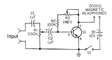 Este circuito fue indicado en una revista americana Electronics Hobbyst de 1974. La revista ya no existe, pero el proyecto puede ser montado con facilidad, pues los componentes son comunes. El transistor puede ser un BC558 o cualquier PNP de uso general. La alimentación se puede realizar con tensiones de 3 a 12 V. Para auriculares de cristal o piezoeléctricos, conectar en paralelo un resistor de 4k7. R3 ajusta la ganancia y la distorsión.