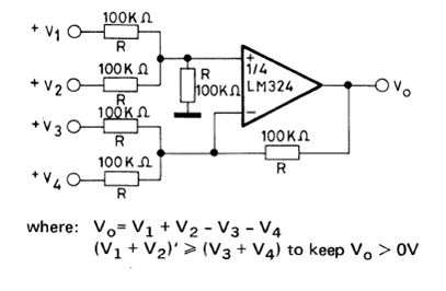 Este amplificador sumador con el operacional LM324 es del manual de circuitos integrados de la SGS de 1982. La fórmula junto al diagrama es válida para la configuración de entrada mostrada. La fuente de alimentación debe ser simétrica.