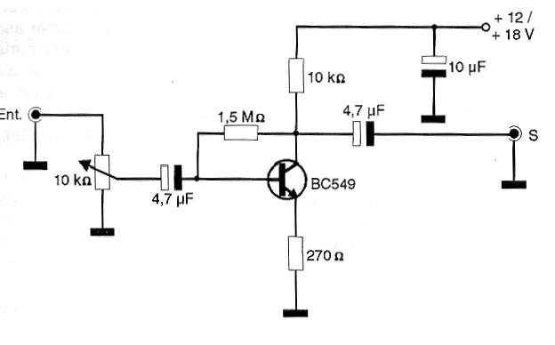 Este paso amplificador de audio de bajo nivel de ruido utiliza sólo un transistor y tiene una ganancia suficientemente alta para operar con fuentes de señal de baja intensidad. La ganancia es dada básicamente por el resistor de 1,5 M ohms que debe ser alterado en función de las características de la fuente de señal. La alimentación se puede hacer con tensiones de 12 a 18 voltios y el potenciómetro actúa como un control de ganancia.