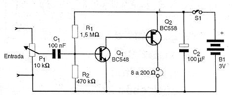 Podemos utilizar este amplificador con auriculares o teléfonos de baja impedancia con buen rendimiento. Las aplicaciones posibles para este circuito van desde seguidores de señales y radios experimentales hasta un estetoscopio simple. Los resistores son de 1/8 W y la alimentación se puede hacer con sólo dos pilas pequeñas.