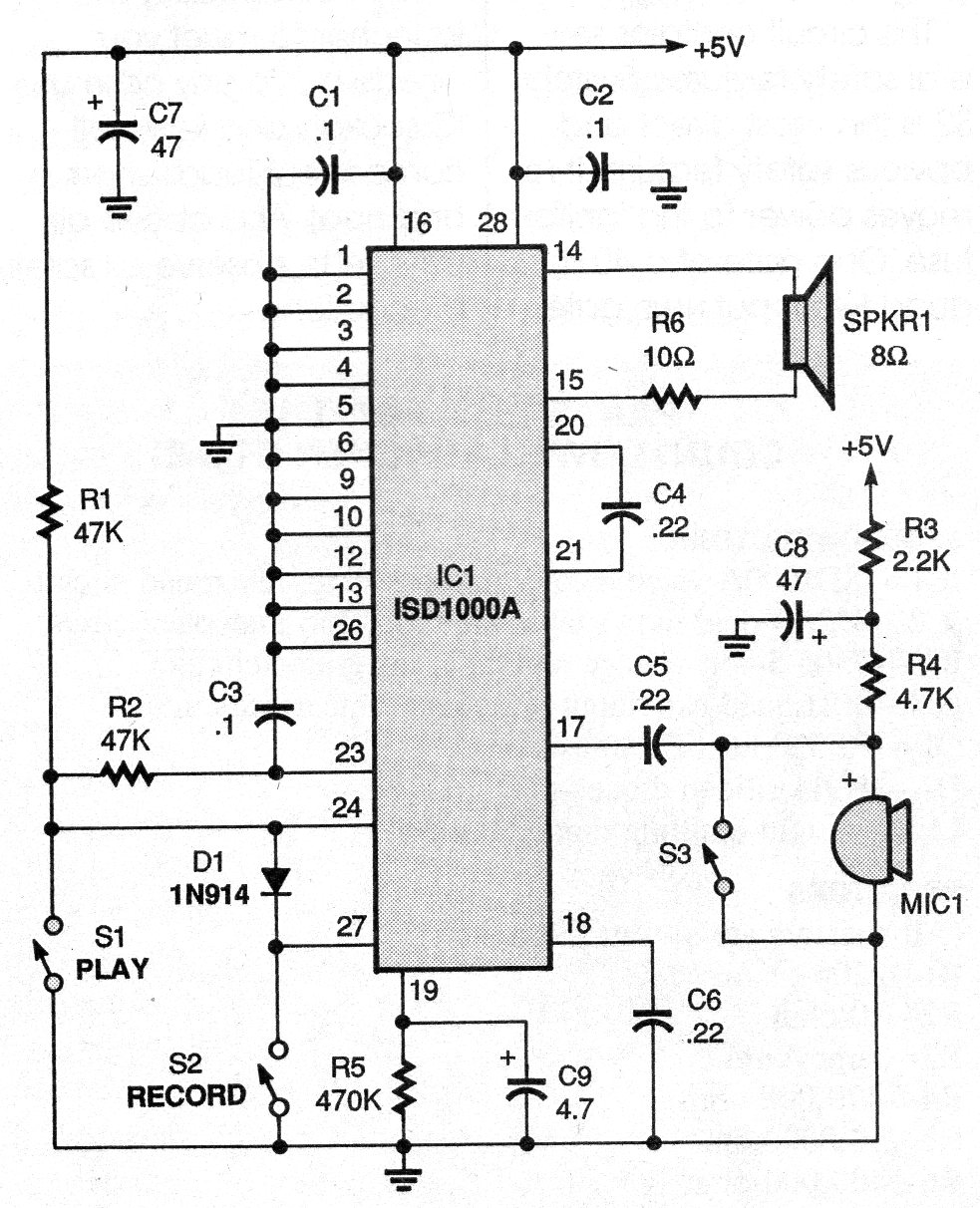 Frases, cuentas regresivas u otras secuencias cortas se pueden grabar en esta grabadora digital. El circuito es la configuración tradicional y con otros integrados de la serie grabaciones largas se pueden hacer.