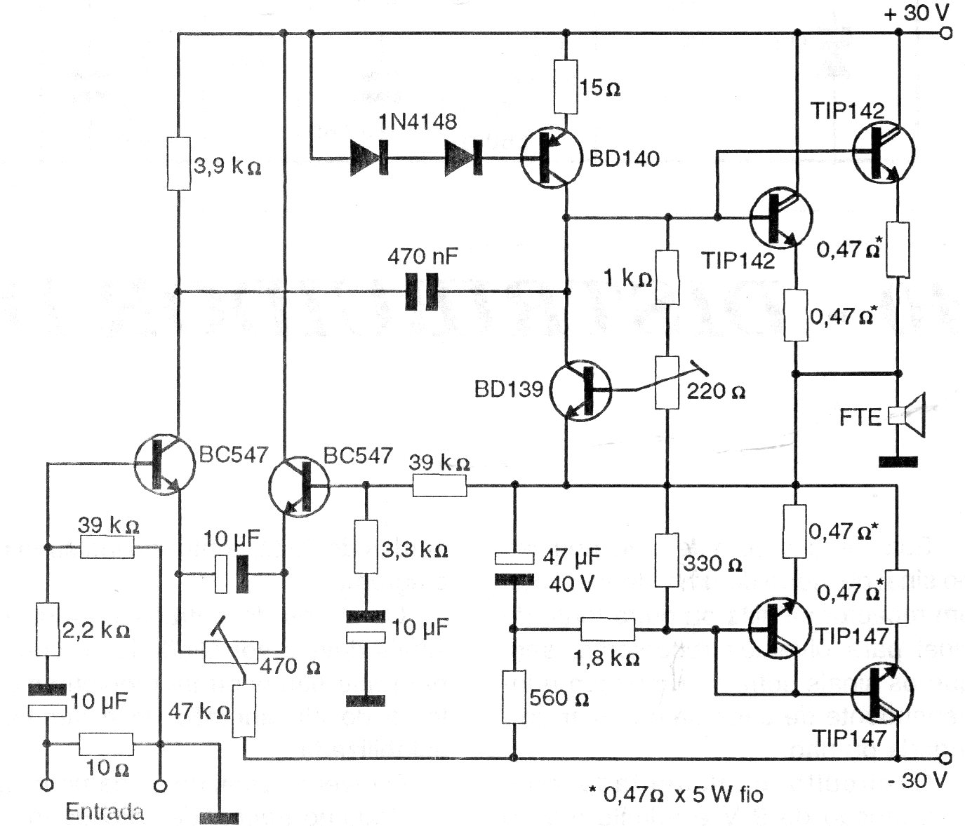 Encontramos este amplificador en una documentación de 1997. La salida será de 130 W con 2 ohms de carga y 60 W con 8 ohms. Con una carga de 4 ohms la potencia será de 90 W. Los transistores de salida deben estar dotados de excelentes disipadores de calor. Especialmente cuidado se debe tomar con el diseño de la placa. En CIR10157 tenemos la fuente para este amplificador.